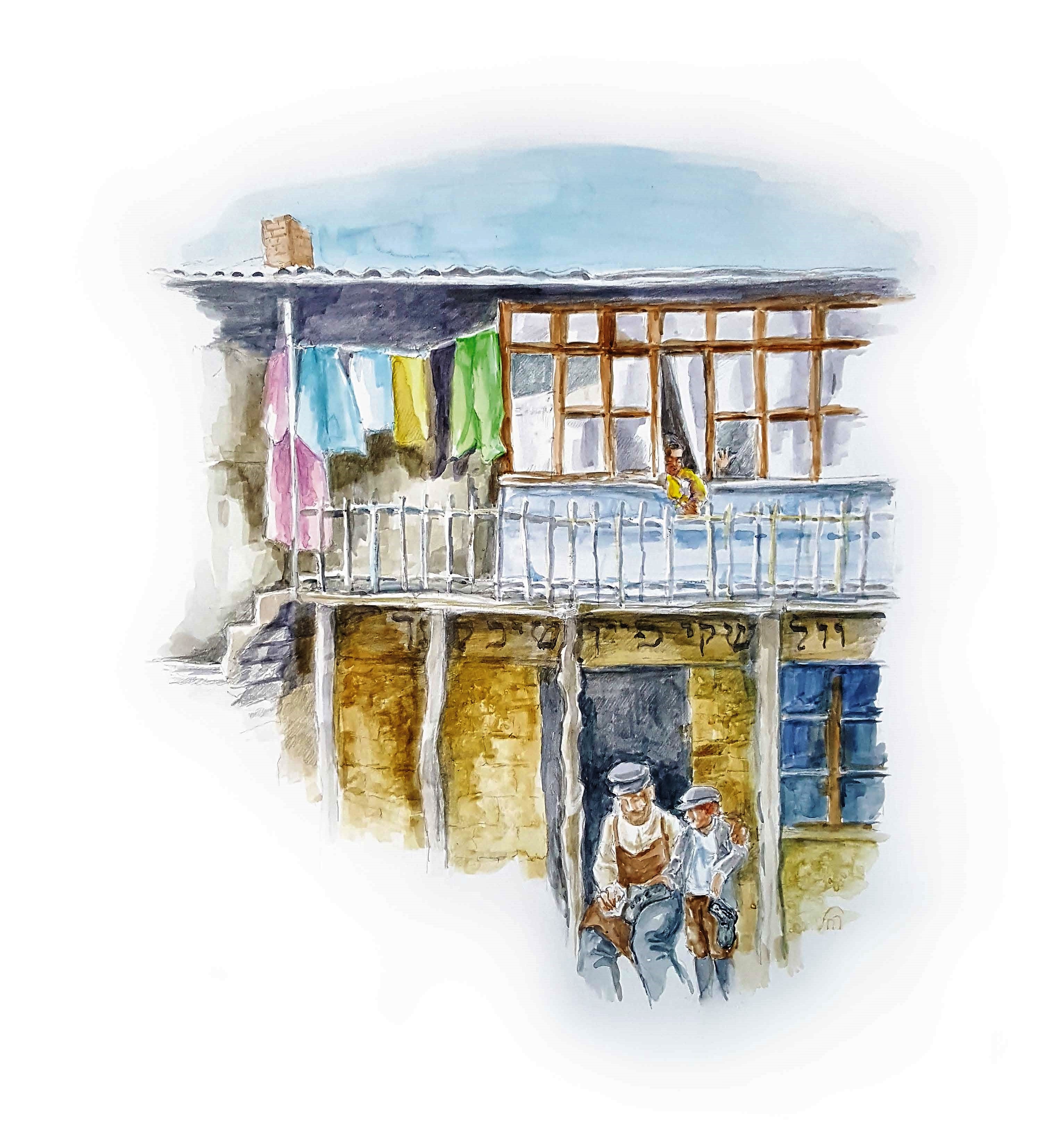 Balcony of the shoe shop Uploaded September 11, 2017 by rochellewisoff Wolinsky and Sons Fine Shoes -Original Artwork © Rochelle Wisoff-Fields