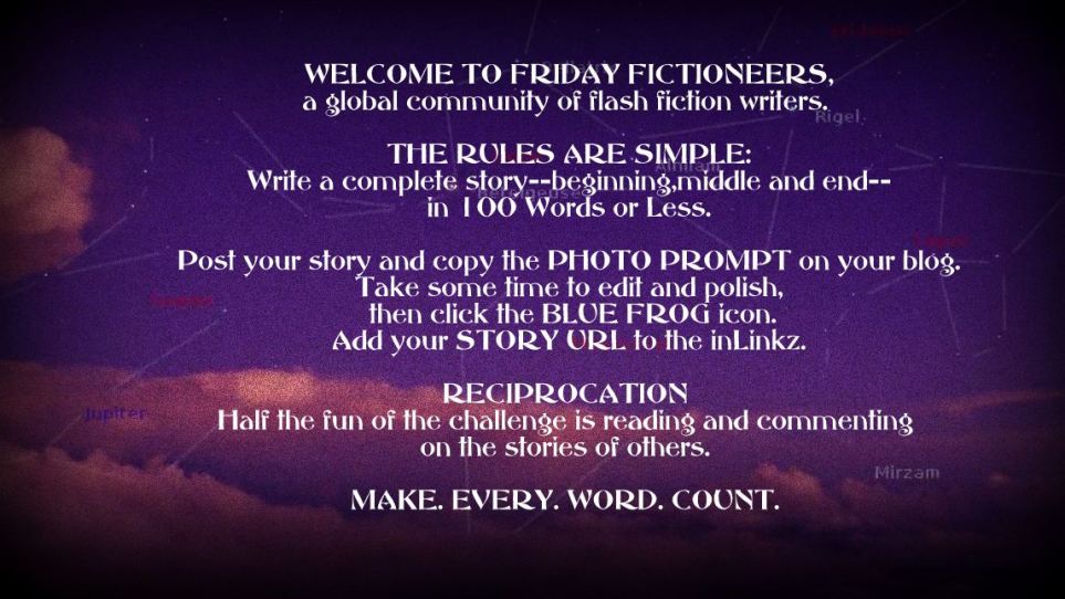 The next photo is the PROMPT. Remember, all photos are property of the photographer, donated for use in Friday Fictioneers only. They shouldn’t be used for any other purpose without express permission. It is proper etiquette to give the contributor credit.