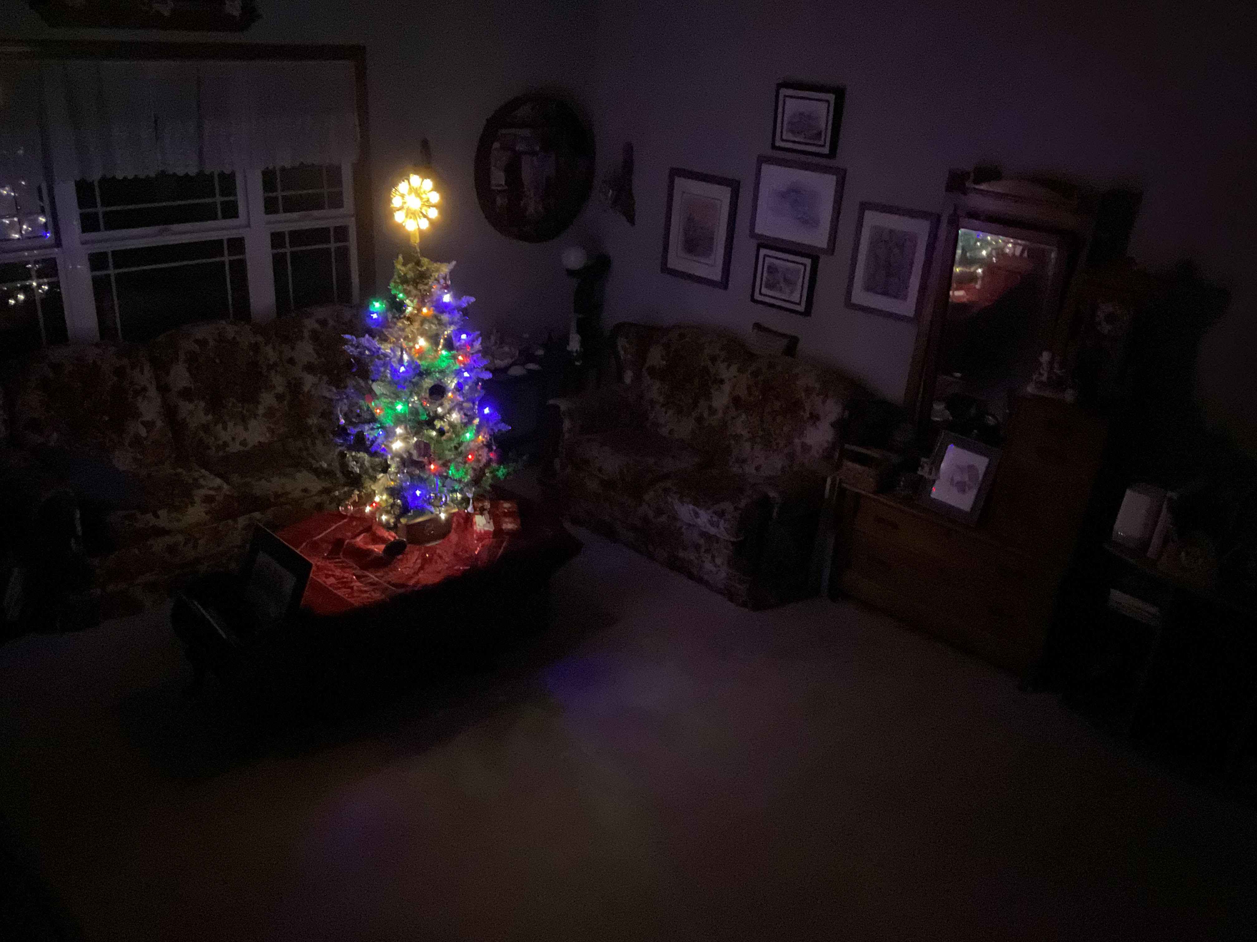 In the photo we see a dining room, lit by candlelight and a hanging fixture with a glass star hanging from it. There’s a mirror on the wall. In it is a reflection of a curio shelf in the living room. There’s a hint of the front door in the sunken living room. We are actually looking at all of this reflected in sliding glass doors. Outside you can see the deck lights and LED lit windchimes that are winged pigs.