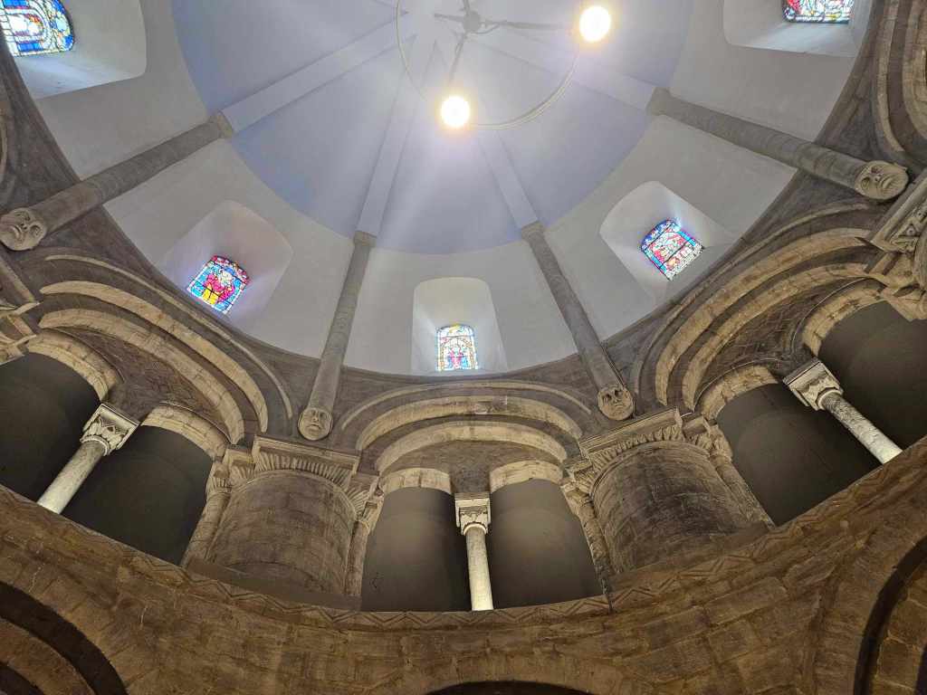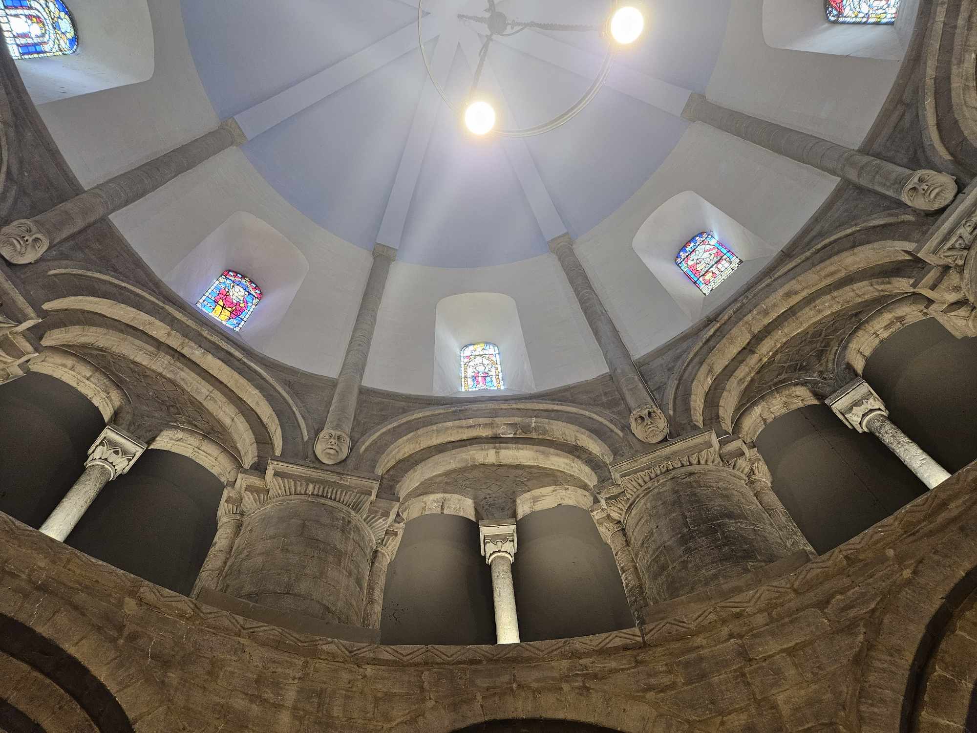 The photo appears to be looking up at a cathedral ceiling with inset stained glass windows. Below the windows looks like a walkway with arched openings.