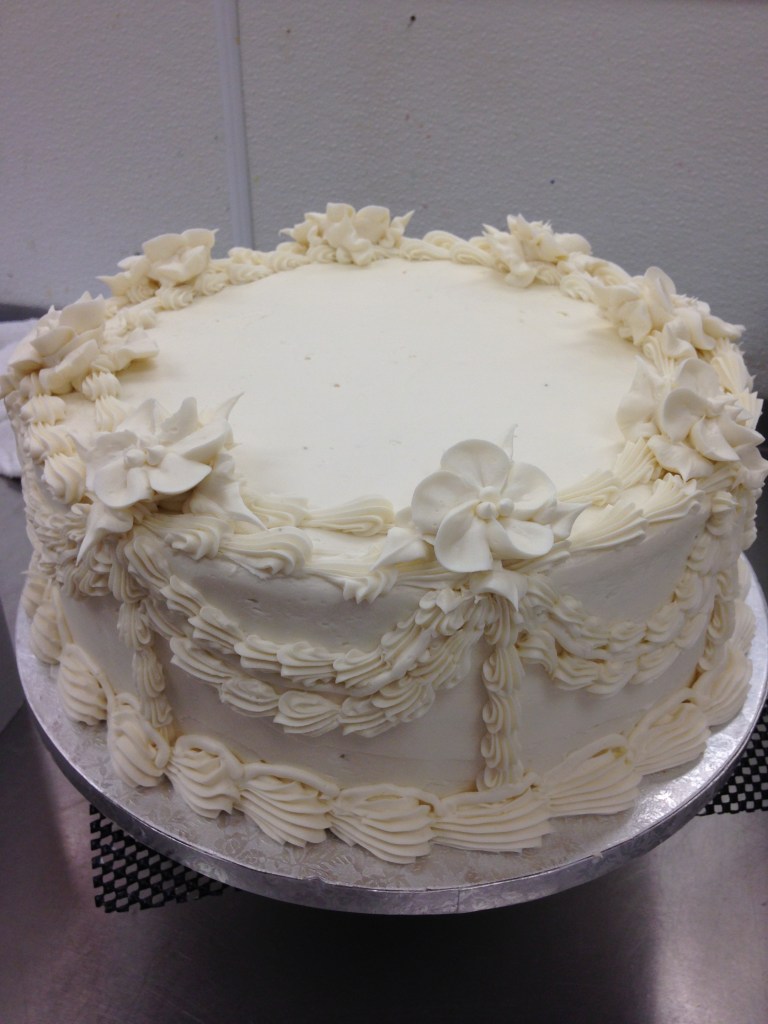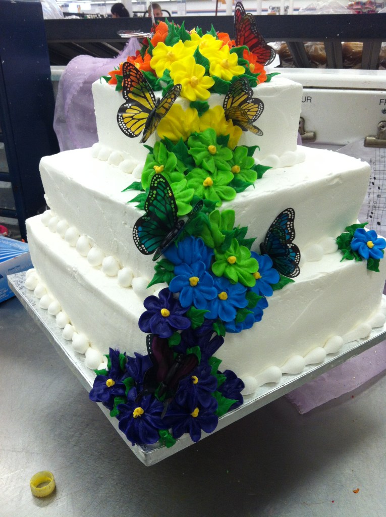 The photo today is of a very colorful three-tiered birthday cake. Lots of swirls, psychedelic flowers, and peace signs. It’s on a turntable. You can see a grocery store in the background and order tickets just behind the cake.