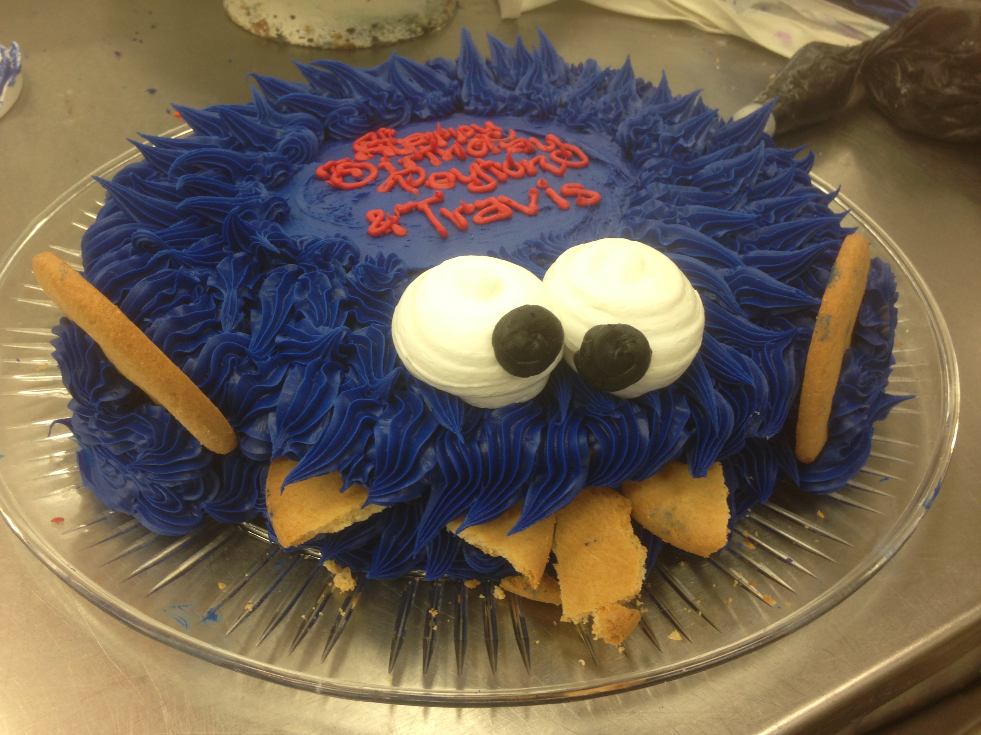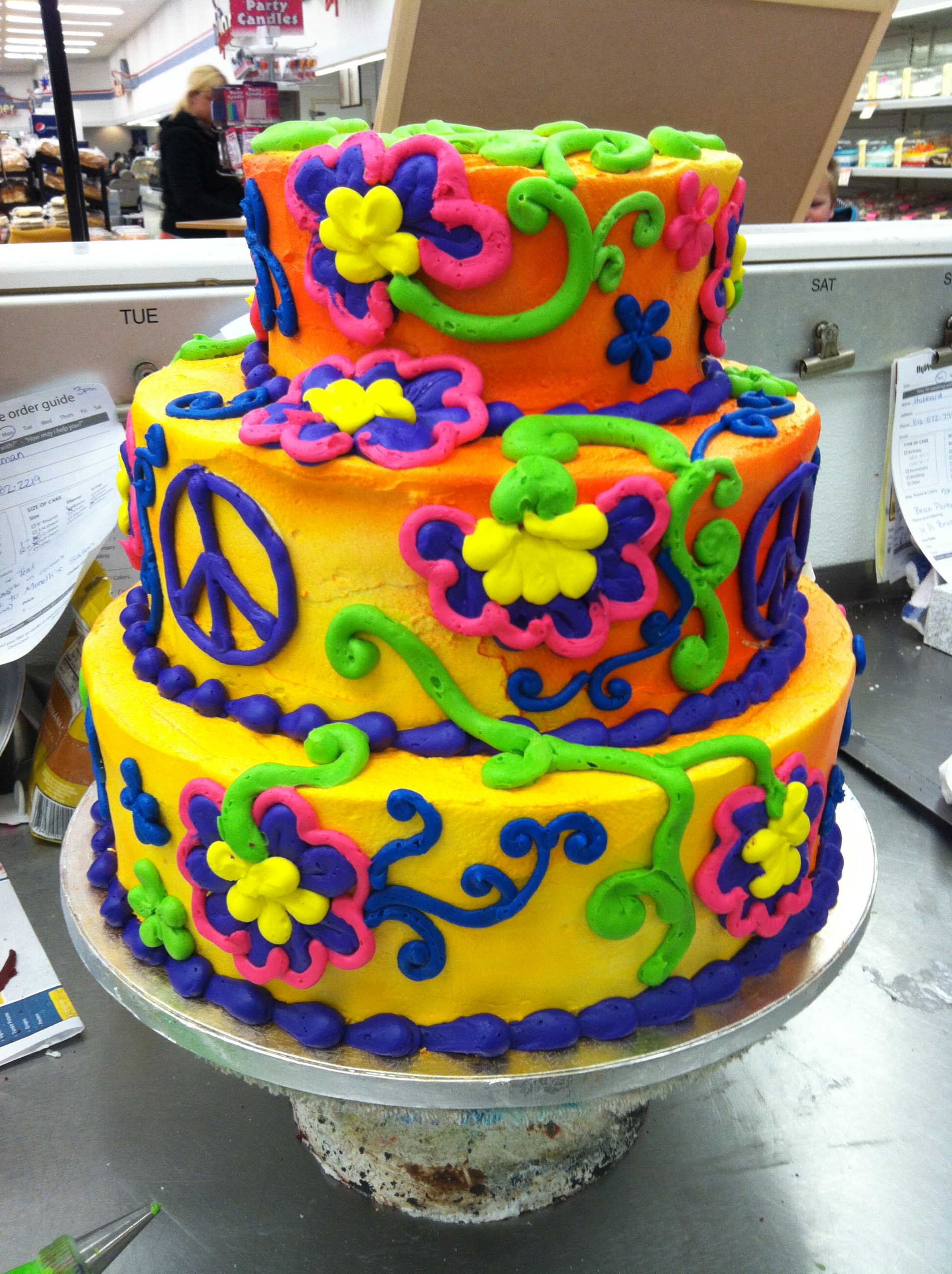 The photo today is of a very colorful three-tiered birthday cake. Lots of swirls, psychedelic flowers, and peace signs. It’s on a turntable. You can see a grocery store in the background and order tickets just behind the cake.