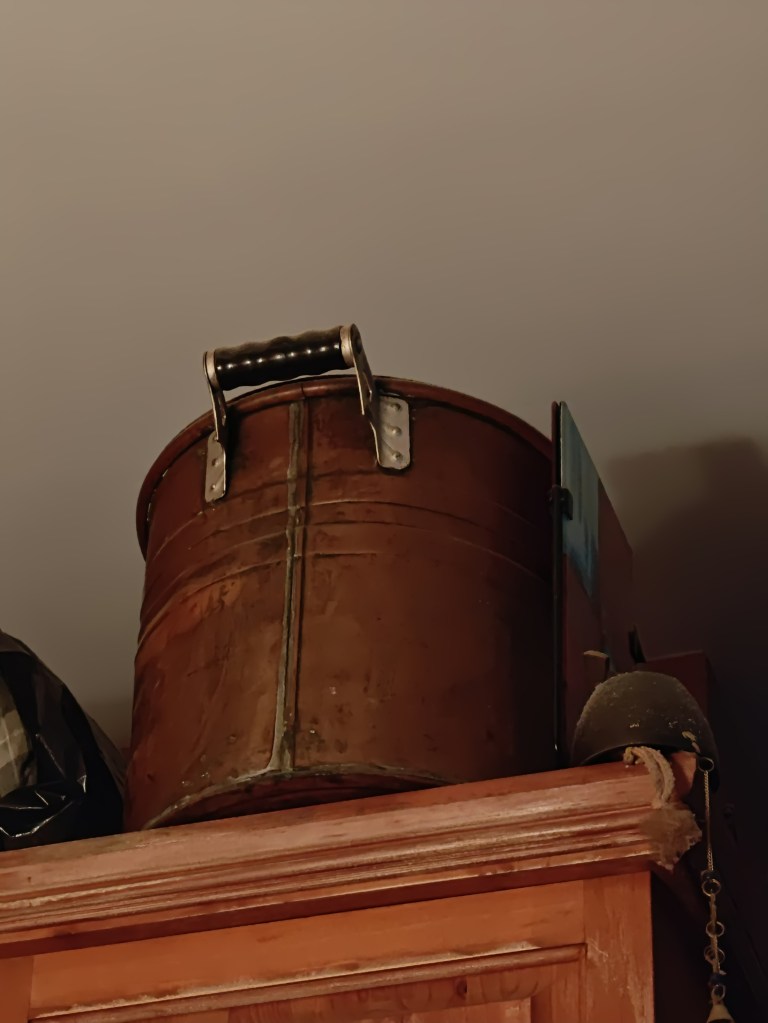 In this week’s photo we see the top of some sort of wooden cabinet. On top of it is a rust colored bucket with a handle close to the top rim. There are other objects next to it but I can’t tell what they are.