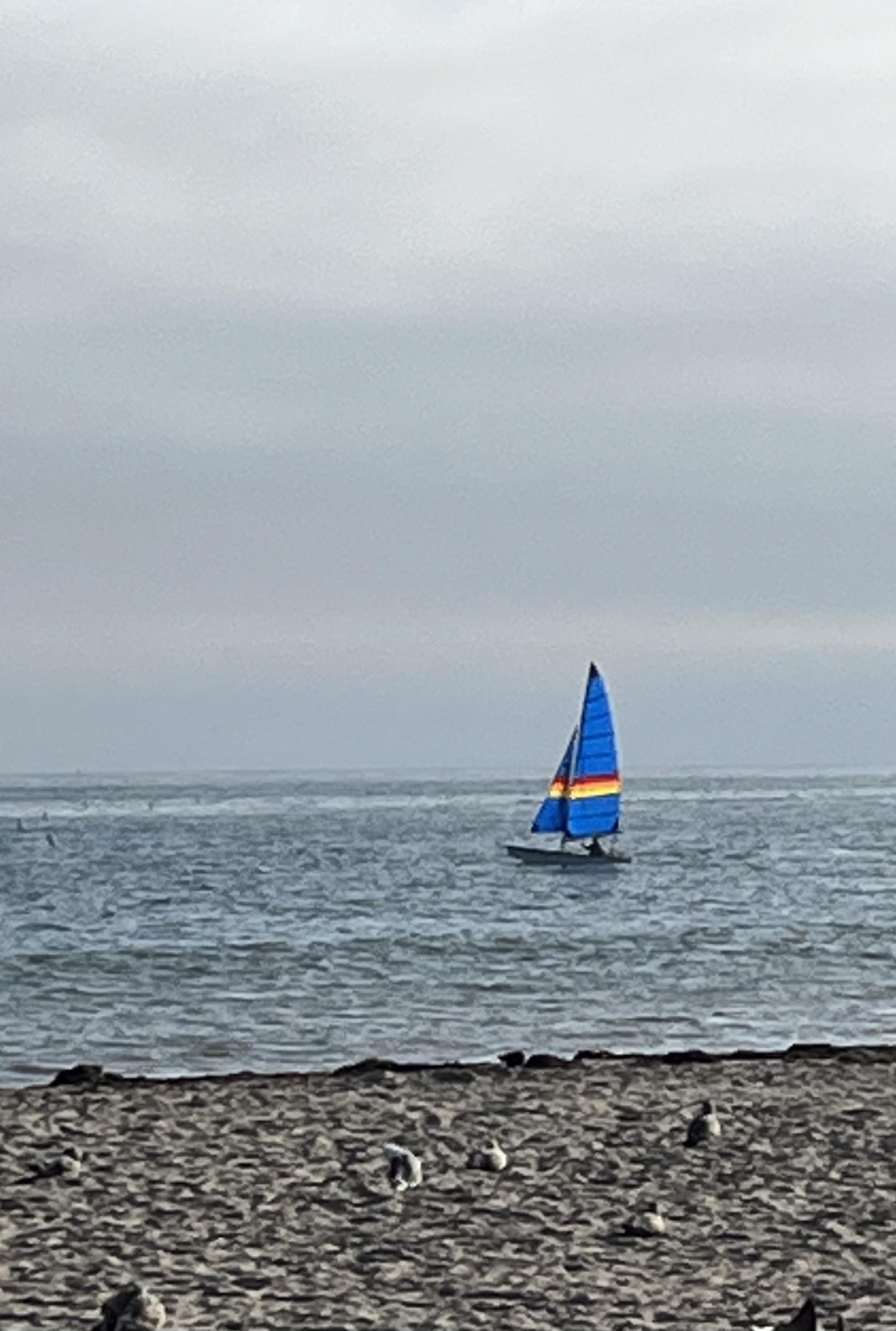The photo is a seascape. On the beach some seagulls are resting. A sailboat with a brightly colored sail is on the water. The sky is overcast.