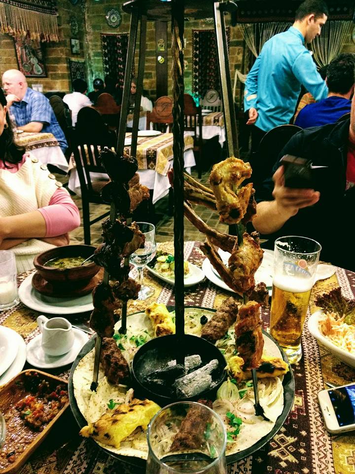 This week’s prompt is in a restaurant. Looks to be Mediterranean. There’s a plate with a tower of meat. To the right is a have drunk glass of beer. There are plates and bowls of food. There are tables in the background with other patrons and a server in the upper right. The tablecloths are colorful. To the right we can see part of an iPhone and there is a patron at the table looking at his cell phone.