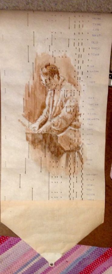 Sarah at the piano on a piano scroll