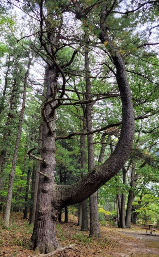 The photo prompt this week is of a forest/park. There is a picnic table to the right in the background. The tree in the foreground has an unusual rounded branch on the right side of the trunk that arches almost to the top.
