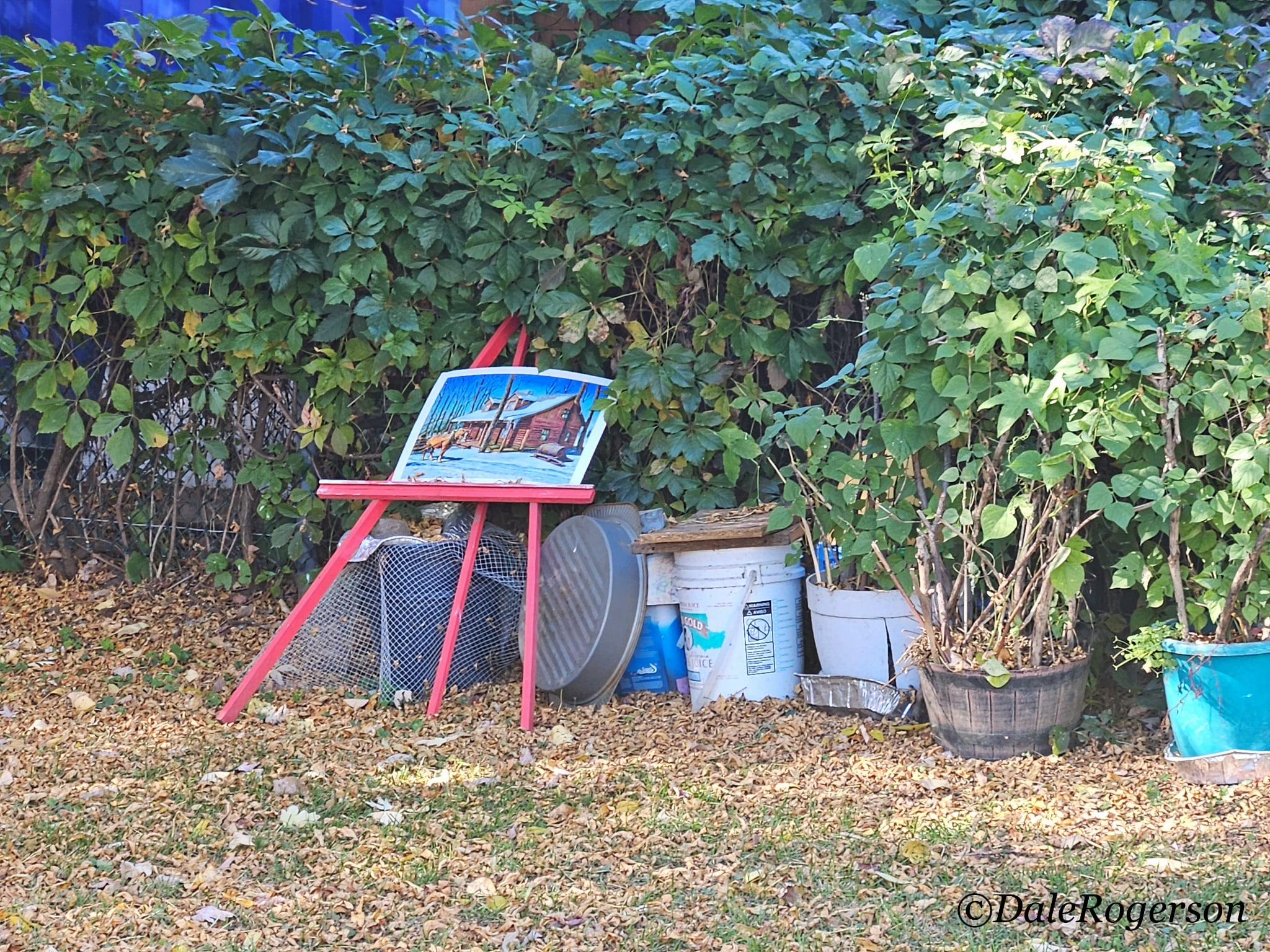 Against a backdrop of trees or bushes is a row of potted plants, plastic buckets and discarded pans. To the far left is a red easel with a picture on it. The easel is falling over backward.