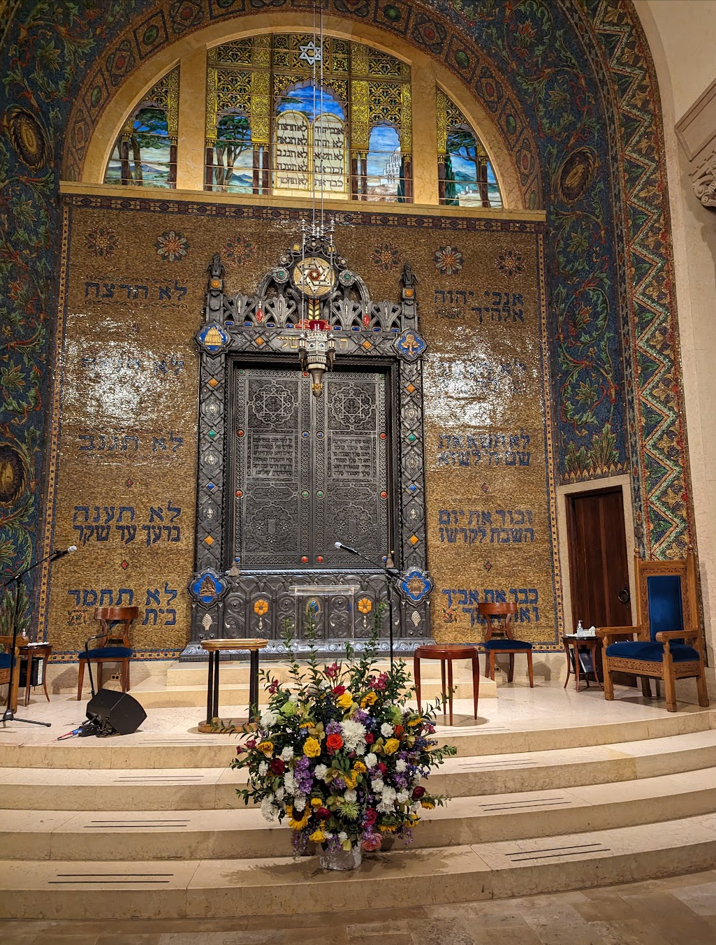 The photo this week is of the inside of an elaborate synagoge. The walls are around the holy ark where the the Torah scrolls are stored, are inlade with tile. The arched window over is stained glass adorned with the ten commandments in Hebrew. In the foreground are steps leading up to the bima or platform. There is a colorful bouquet in the middle on the steps.