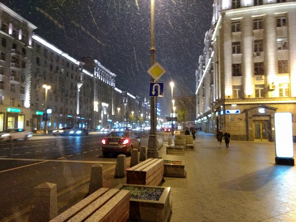 This week’s photo is of a city street at night. The buildings are well lit. It’s raining. Headlights reflect on the wet pavement. There are people walking along the sidewalk.