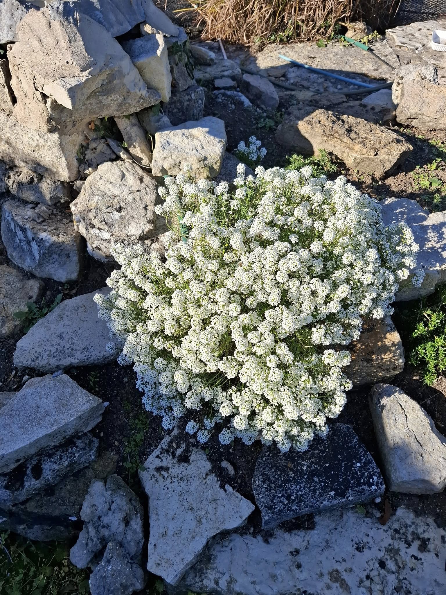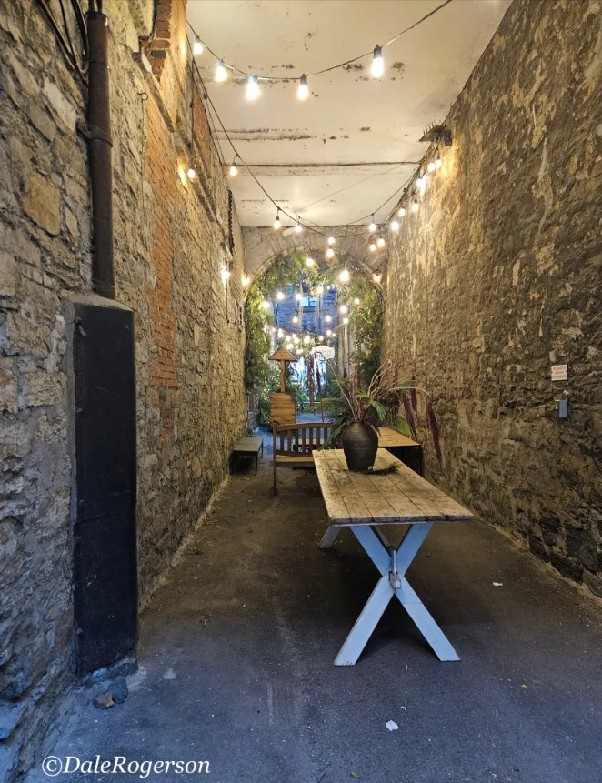 In this week’s prompt we are in an alleyway between two stone walls. Lights are strung across the arched entry. There are picnic tables and a bench.