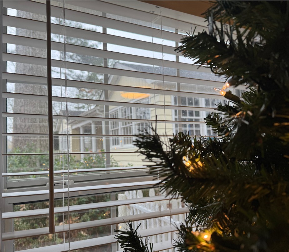 The photo is of a window with an open Venetian blind. Through it we see the front of a yellow house with white trim. Beside the windw is the edge of a Christmas tree with lights.