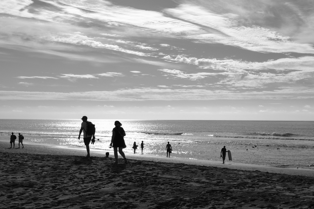 This week’s photo is of silouhetted figures on the beach and in the water. The sun is reflecting off the water. There are whispy clouds overhead.