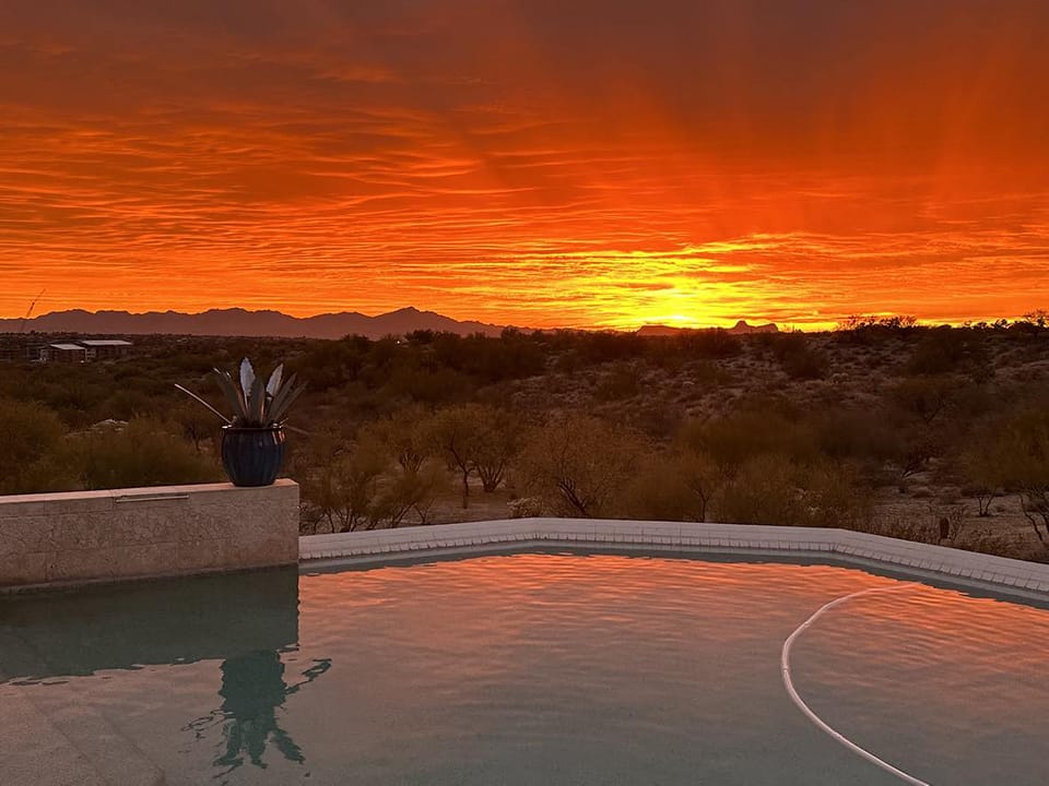 In the photo we see the edge of a swimming pool at sunset. There’s a potted plant on a partial wall to the left. The sky is ablaze over trees and mountains in the distance.