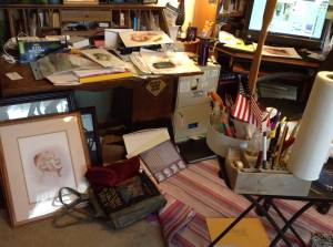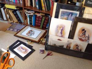 I didn’t think I’d have much to show, but thanks to Alexis, who is an artist herself, my stack of prints grew. My office/studio took on the appearance of an explosion in an art gallery. We found thrift stores to be wonderful places to find gently used frames, some with pristine mats that were the perfect size for my prints.