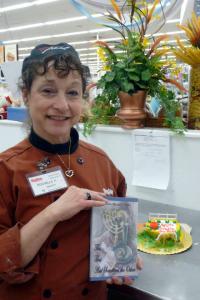The photo today is of a very colorful three-tiered birthday cake. Lots of swirls, psychedelic flowers, and peace signs. It’s on a turntable. You can see a grocery store in the background and order tickets just behind the cake.